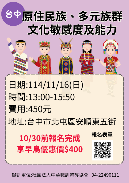 課程名稱:【台中】原住民文化安全、多元族群文化敏感度及能力之課程3H