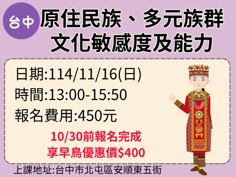 【台中】原住民文化安全、多元族群文化敏感度及能力之課程3H